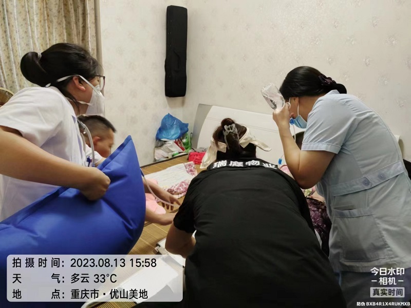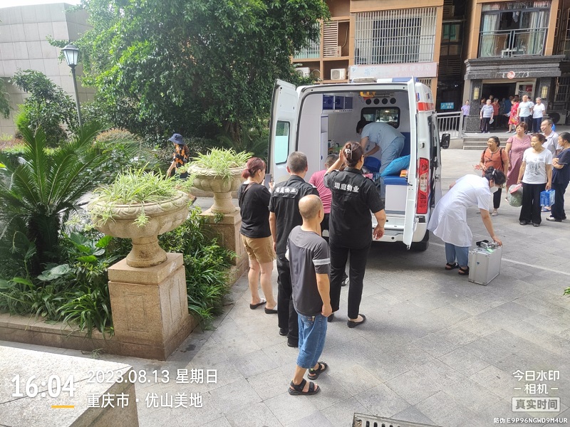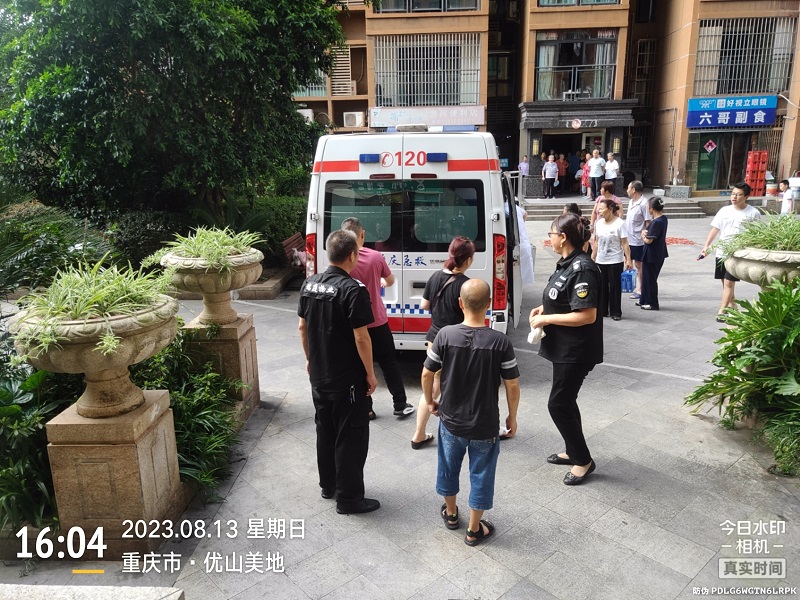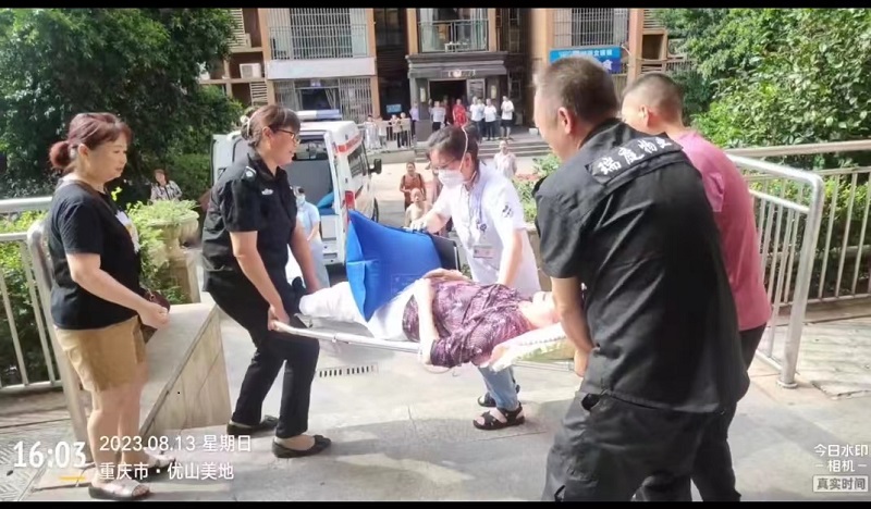 2023年8月13日下午3点50分左右,我司在管优山美地小区客户中心突然接到1-3-9业主求助,称家里患老年痴呆症的80多岁老人突发疾病,急需送往医院,需保安帮忙抬病人到楼下救护车上。客户中心接到电话后立即通知安全部刘国军安排人员:董友义、周义先及工程部王秀水等四位同志一同赶往1-3-9业主家里,小心的将病人慢慢的挪到担架上,将病人的头部垫好,几个人合力再抬到电梯里(从1-3-9家到电梯的楼层通道窄)并及时的送上了120救护车。